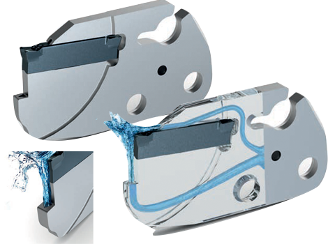ARNO's ACS2 (Arno Cooling System) has been a game changer in traditional production parting and grooving operations for years. ACS2 provides two sources of coolant through the tool, directly to the cutting edge... one under the clamp to immerse the top of the insert where the chip is formed, and one vertically under the flank of the insert. This design allows for the ultimate in cutting edge cooling without the need for external coolant lines. The result is increased tool life, improved chip control, and to introduce more process stability.
